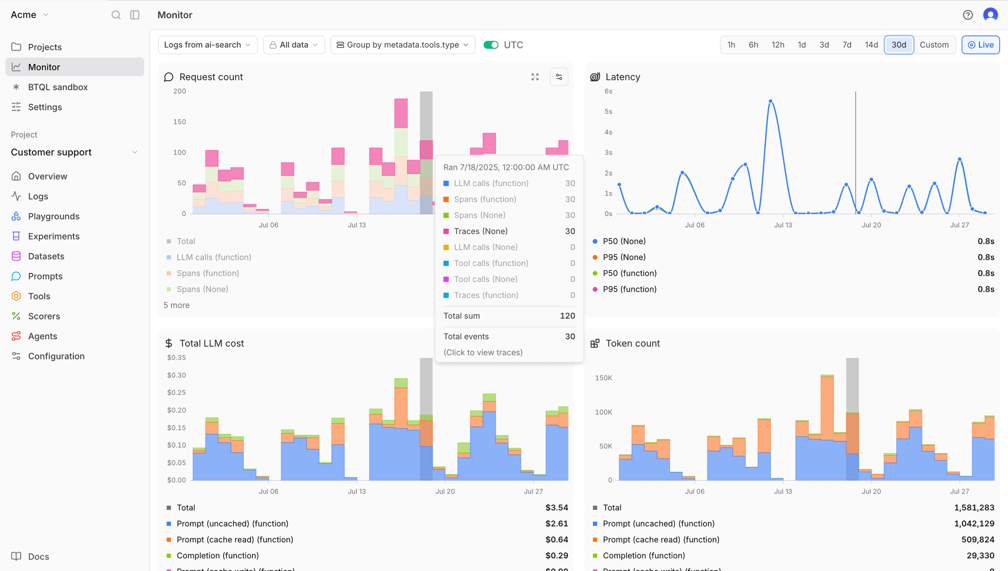 • Granular cost analytics: Breaks down spending per request, user, and feature, identifying which specific prompts or tool calls drive up costs.
