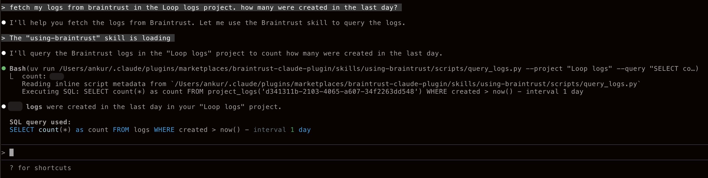 The second plugin, braintrust, brings Braintrust data back into Claude Code so developers can query logs, fetch experiment results, and log new data directly from the terminal using natural language.